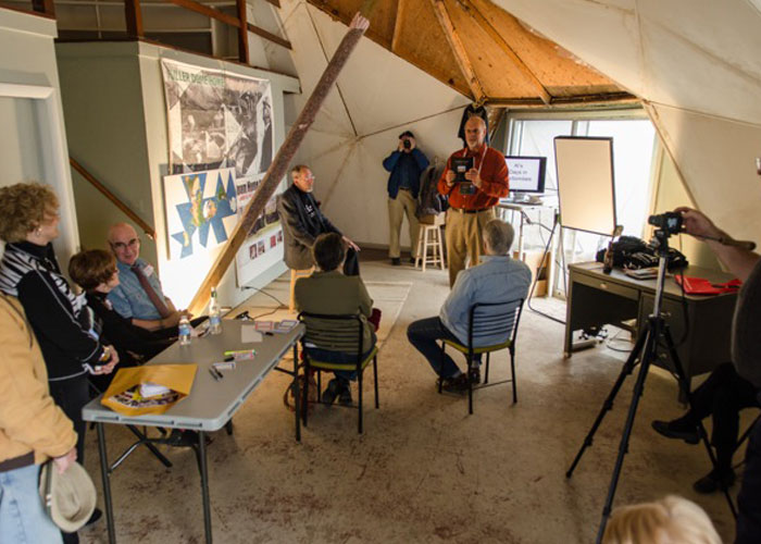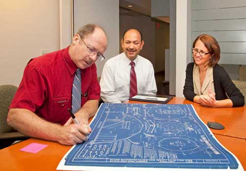 Thad Heckman, of the architectural practice 'Design Works', signing the Blueprint in Washington D.C with Robert Arzola, Historic Documentation Programs, and Catherine Levoie, Chief, Historic American Buildings Survey of the National Park Service. Thad is also a former board member of RBF Dome NFP and a retired SIU faculty.